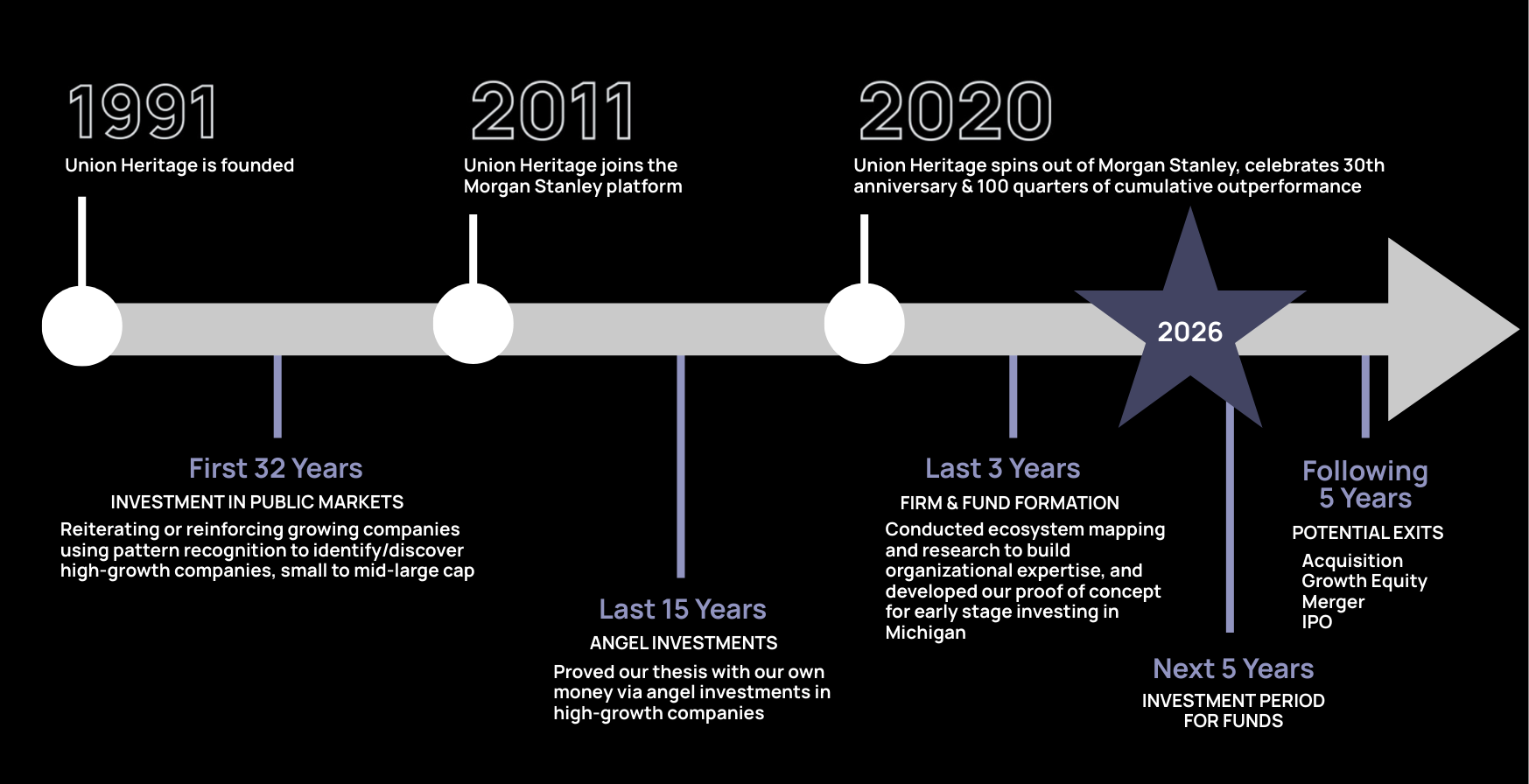 Union Heritage is an investment advisory company with three lines of business: Public Equity, Venture Capital, and Philanthropic Investment. We have leveraged our demonstrable expertise in these strategies to help build and safeguard the legacies of our clients since our founding over three decades ago.